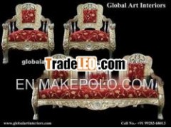 Item Description : White metal and brass sofa setmade of brass and white metal mounted on wooden handicraft inVictorian style including one sofa 3 seater and 2 sofa chairs(total 3 piece set) with red cushion fabric.