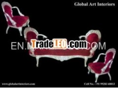 Item Description : Room Furniture sets in Indiantraditional style made of white metal (German Silver) and teakwoodcarving 3 piece sofa set with floral design in red cushionfabric.